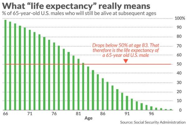 “预期寿命”的真正含义见下面的图表。它绘制了65岁的美国男性在不同年龄段仍然活着的百分比。请注意,根据最新的社会保险精算表,50%的人在83岁时仍然活着,这就是为什么社会保险报告65岁男性的预期寿命为83岁。(65岁女性的图表会延伸得更远;他们存活的比例直到86岁才会降到50%以下。)