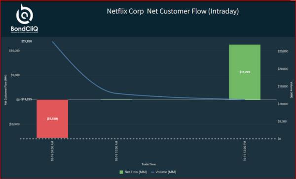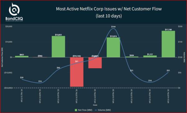 数据解决方案提供商BondCliQ Media Services的以下图表显示,随着时间的推移,Netflix的债券受到了更多的买盘。市场消息人士称,息差已收窄3至5个基点。