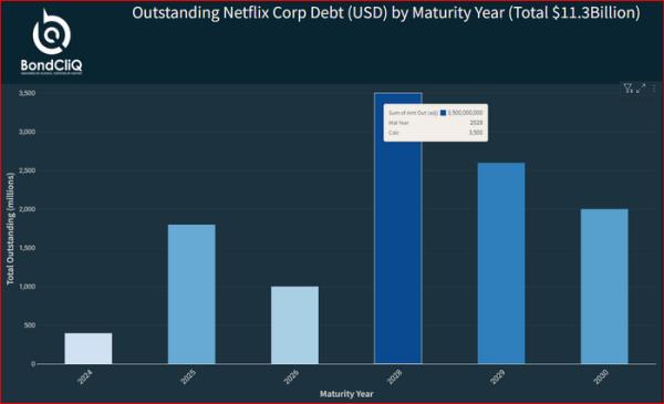 Netflix未偿债务(美元)按到期年计算(总计113亿美元)。来源:薄熙来和cliq媒体服务