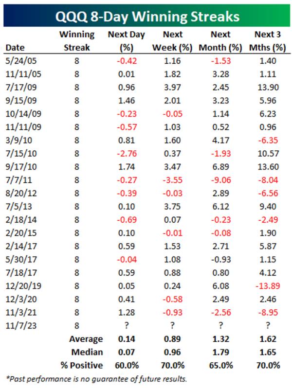 Bespoke表示,如果今天的收盘价更高,将标志着QQQ在该ETF的历史上第21次连续8天上涨,并指出该ETF有60%的时间将涨势延长至第9天(见下表)。