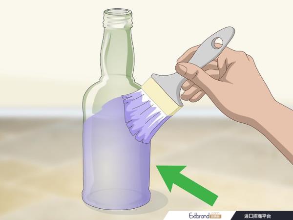 用油漆刷给你的酒瓶上漆。如果你要做一个纯色,使用一个大的油漆刷来工作得更快。如果你在一个瓶子上画多种颜色,使用较小的画笔,这样你可以更精确。别忘了在瓶底和吸口周围的边缘涂上颜料。你不必把酒瓶漆成纯色。选择你喜欢的设计或图案,把它们画在瓶子上。