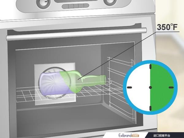 将酒瓶放入烤箱烘烤30分钟。将酒瓶放入烤箱,将温度设定为177°C。设置一个30分钟的计时器,然后将瓶子从烤箱中取出。
