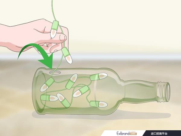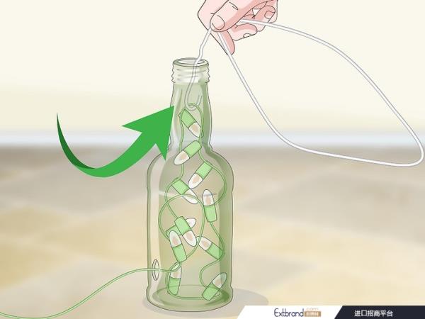 只能用一面,否则穿不进去。把没有插头的一端从洞里滑出来,一直把电线穿过去,直到所有的灯都在瓶子里。