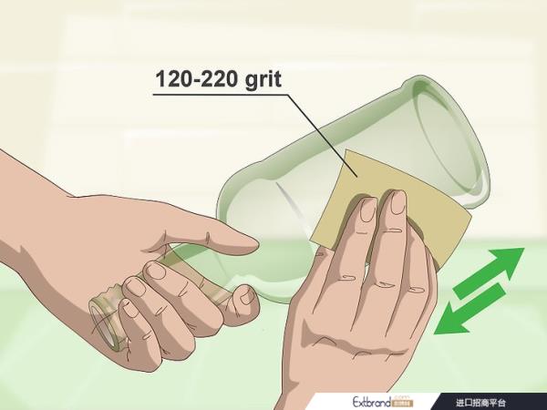 用细砂纸刮酒瓶表面。寻找等级在120到220之间的砂纸。用砂纸在酒瓶上做圆周运动,直到酒瓶完全被划痕覆盖。这些划痕会让你要用的粘合剂更容易粘在瓶子上。