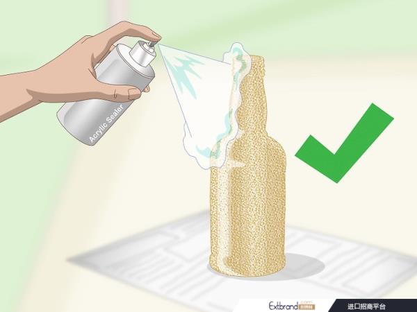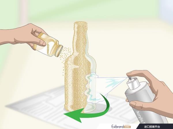 向整个瓶子喷上封口剂,将闪光剂密封到位。额外的丙烯酸密封剂涂层将帮助闪光留在瓶子上。记住,当你触摸瓶子时,一些闪光剂会从瓶子上掉下来。当你拿着瓶子的时候要小心,以免闪光剂弄到你的衣服上。