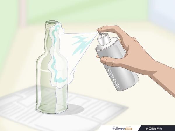 用丙烯酸密封喷雾剂喷洒瓶子的一部分。丙烯酸密封剂可以作为闪光片的粘合剂。将封口机保持在距离瓶子3英寸(7.6厘米)的地方,然后从瓶子上喷射