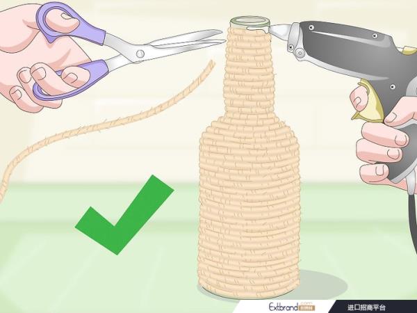 用剪刀把绳子从卷筒上剪下来,把末端粘在瓶子上。在瓶口的正下方涂一点热熔胶。将麻线的末端压入热熔胶中。o