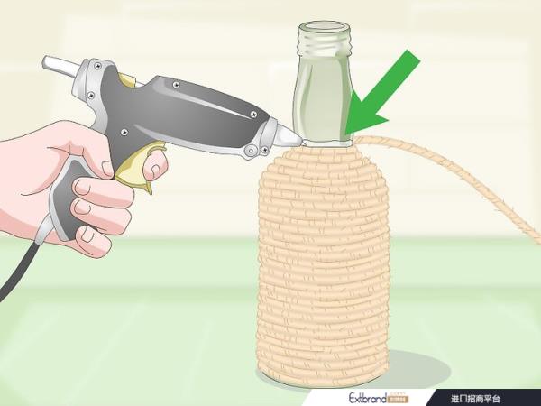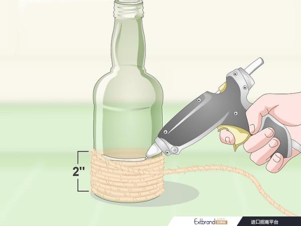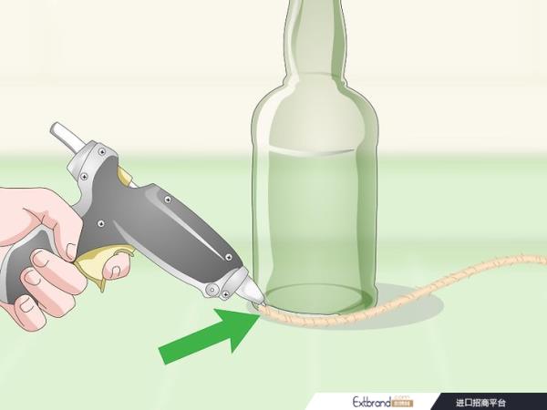 用胶水把一卷粗线的末端粘在酒瓶的底沿上。使用热熔胶枪,使麻线固定在瓶子上。滴一滴