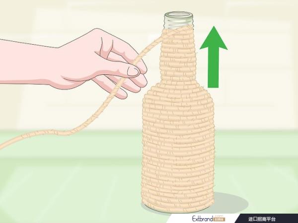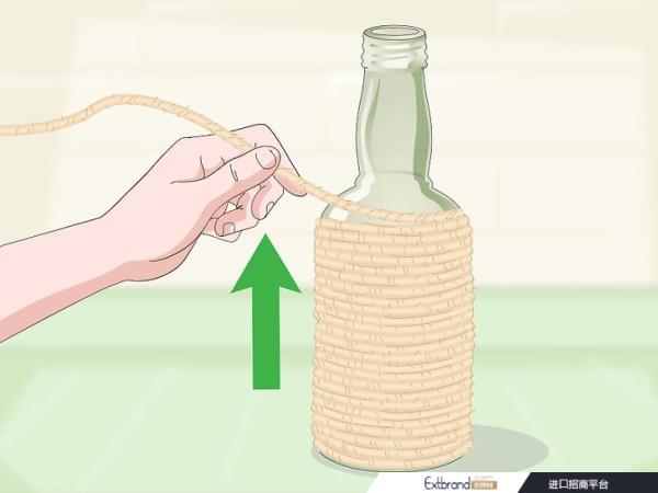把绳子紧紧地缠绕在瓶子上,直到你到达瓶口。当你缠绕它的时候,绳子的环之间不要留下任何缝隙。你不应该透过绳子看到玻璃酒瓶。不要在绳子上的环上涂热熔胶