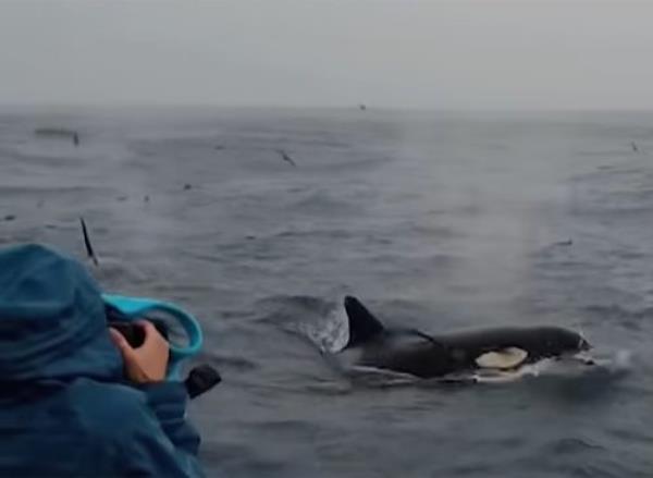 研究小组在前往他们通常观察逆戟鲸的地点的途中看到了水中的虎鲸。“几秒钟后,我们意识到他们正在攻击一个大东西。然后我们意识到,哦,天哪,这是一头蓝鲸,”托特德尔说。