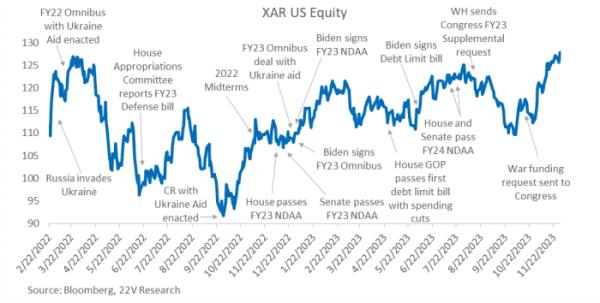 分析师在分享了下面的图表时写道:“本周截至周四收盘,XAR上涨了0.5%,昨日的势头最为强劲,因为国家安全立法方案的最终行动已经确定。”