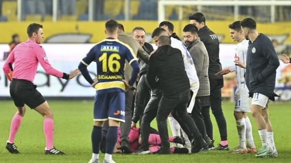 哈利勒·乌米特·梅勒在球场上被安卡拉古库主席法鲁克·科卡击中,引发了混乱的场面,球员和官员加入混战或试图干预。