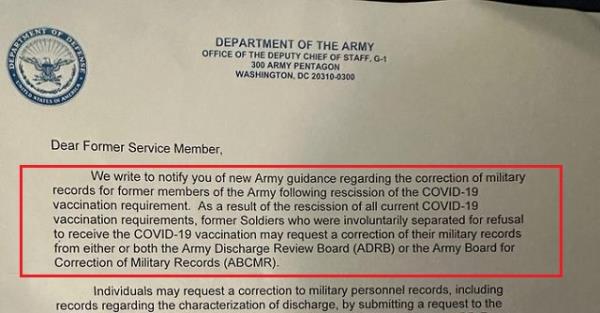 信中说:“由于取消了所有现行的COVID-19疫苗要求,因拒绝接种COVID-19疫苗而非自愿分离的前士兵可以要求更正其军事记录。”