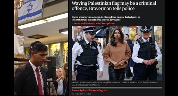 来自《卫报》,“布雷弗曼告诉警方,挥舞巴勒斯坦国旗可能是刑事犯罪”: