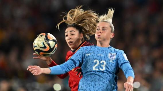 西班牙队的奥尔加·卡莫纳和英格兰队的阿莱西亚·鲁索在世界杯决赛中争夺球权。
