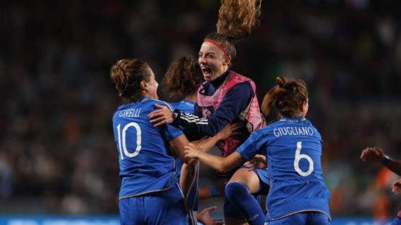 女足世界杯,意大利队战胜阿根廷队,在终场哨声响起时庆祝胜利。