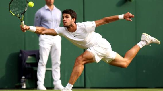 在温布尔登男子单打决赛中,阿尔卡拉斯伸直身子打正手。