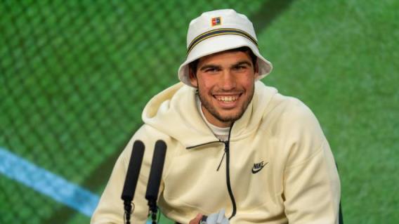 阿尔卡拉斯在新闻发布会上戴着一顶水桶帽,看起来很高兴成为温布尔登冠军。
