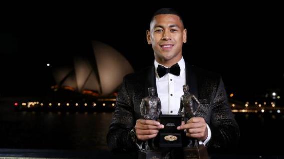 布里斯班野马队的杰米·伊萨科(Jamayne Isaako)在2018年与Dally M最佳得分王、年度最佳尝试奖和年度最佳新秀奖合影。