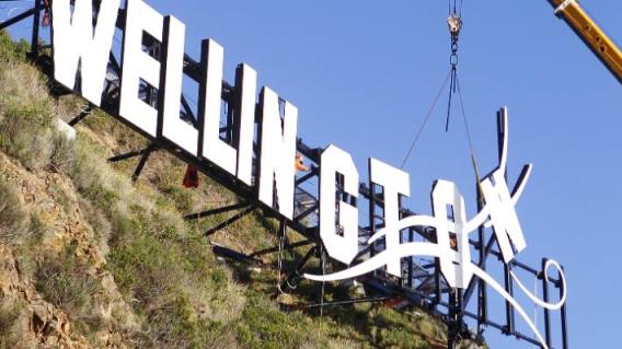 惠灵顿机场于2012年树立了惠灵顿吹走标志。
