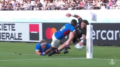 全黑队后卫TJ佩雷纳拉在东京大胜纳米比亚的比赛中得分。