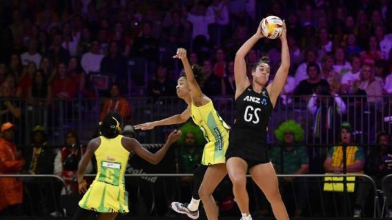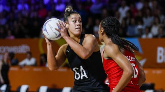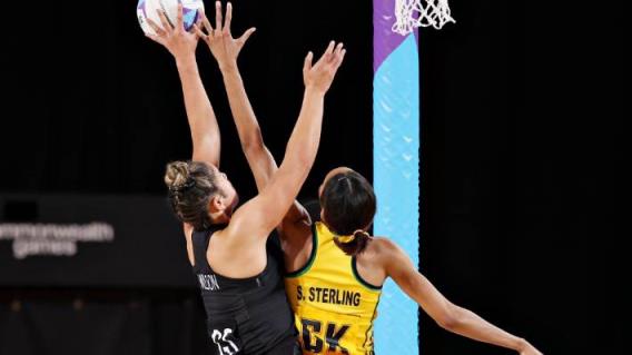 在2022年英联邦运动会上,银蕨队的射手Maia Wilson在牙买加选手Shamera Sterling的压力下控制着球。